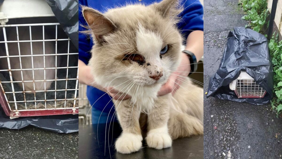 The one-year-old ragdoll cat, named Artex by rescuers had lost an eye and was cowering in a dirty cat carrier inside a black bin bag when he was found last month.